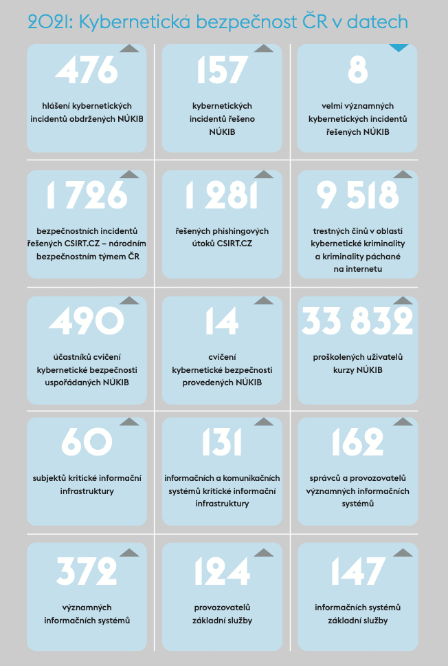 Národní úřad pro kybernetickou a informační bezpečnost (NÚKIB) odeslal vládě k projednání Zprávu o stavu kybernetické bezpečnosti České republiky za rok 2021. Nepřekvapivě v roce 2021 narostl počet škodlivých kybernetických aktivit, NÚKIB zaznamenal celkem 157 kybernetických bezpečnostních incidentů (v roce 2020 jich bylo 99), nejčastějšími typy útoků byly phishing, podvodné e-maily a skenování vnější sítě.