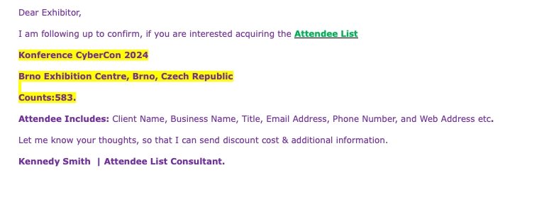 Vtipnou tečkou na závěr je nabídka na CYBER_CON od „hackerů z Alabamy“, resp. od spammera pana Kennedyho Smitha, který slibuje mi zaslat seznam účastníků slovutné brněnské konference. Ne, Smithe, ne!