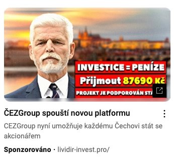 A bude hůř. Prakticky na všech velkých platformách typu YouTube nebo Facebook se denně setkávám s nabídkou „skvělých investic“. „ČEZGroup spouští novou platformu“, informuje mě prezident této země, Petr Pavel. A následuje odkaz vedoucí na falešnou stránku, která jako by z oka vypadla webu Novinky.cz a která dál omotává podvodnými pastičkami možnou oběť.