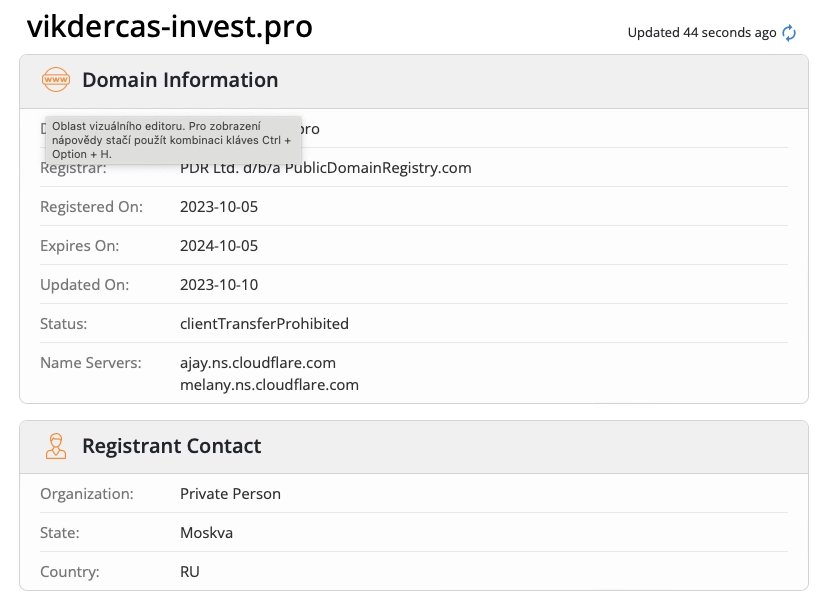 Doména pochybného webu visí samozřejmě na Cloudflare, zaregistrovaná na soukromou osobu, která uvedla jako místo svého působení Moskvu.