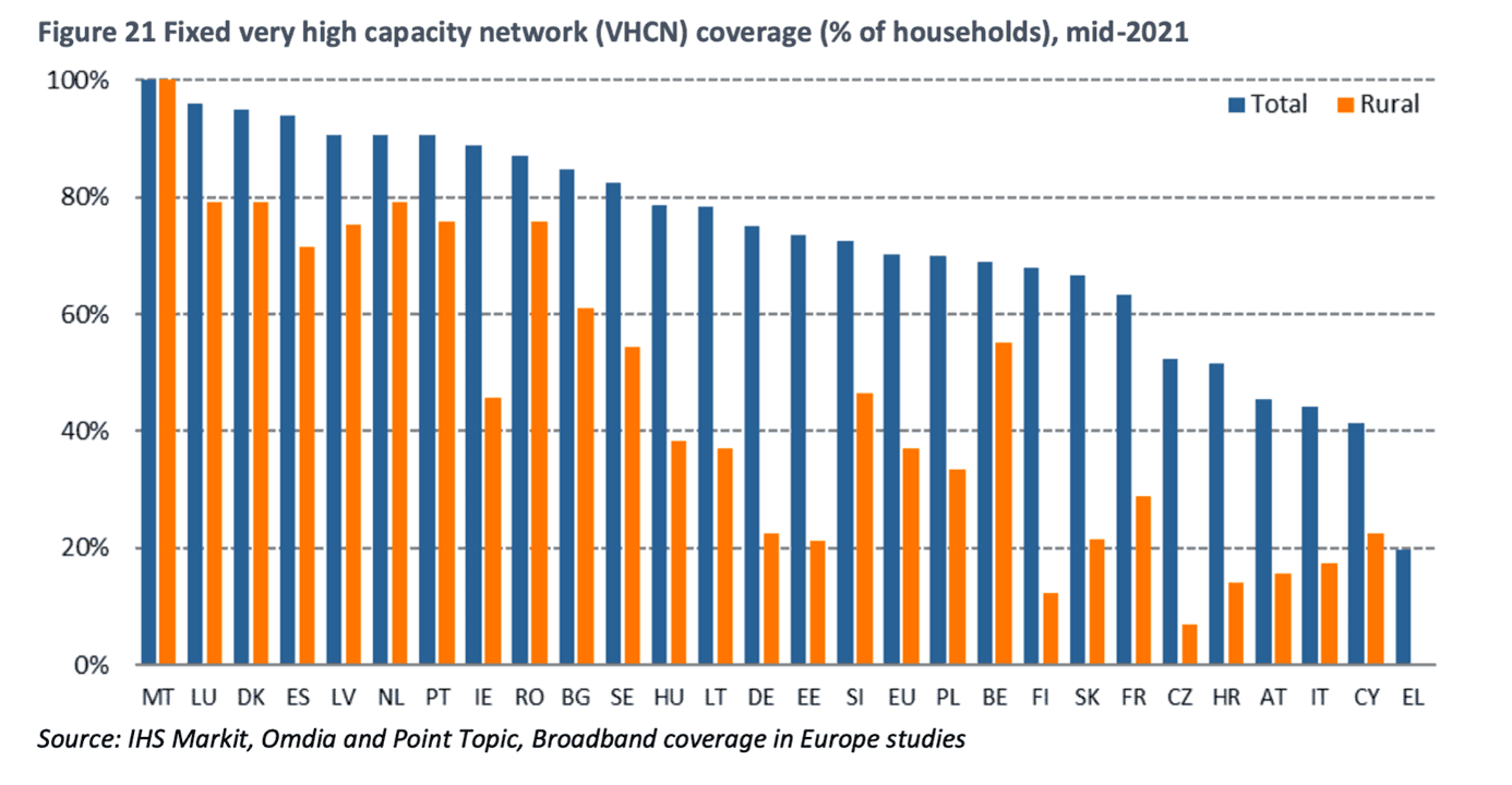 V oblasti mobilních sítí bylo v Česku přiděleno 67 % celkového harmonizovaného spektra 5G, což je více než průměr EU (56 %). V roce 2021 měla technologie 5G pokrývat 49 % obydlených oblastí v Česku. To Evropská komise hodnotí jako výrazné zlepšení ve srovnání s žádnou oblastí pokrytou 5G v roce 2020. Logicky, nebyla aukce, nebylo 5G.