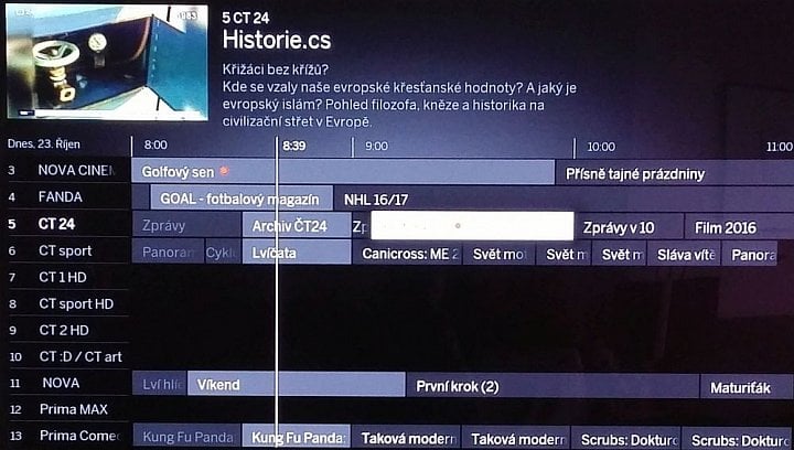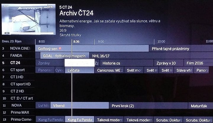 Programová nabídka ukáže pět kanálů a pro vybraný pořad také informace o začátku a konci vysílání a několik řádků podrobnějšího popisu. V kompletu se pak objeví po zmáčknutí OK. Pokud ale OK stlačíte na aktuálním pořadu, jste přepnuti na kanál, i když jinak se po EPG můžete pohybovat zcela libovolně. Na tlačítku Menu najdete ještě volbu Změnit náhled a pokud vyberete Komprimovaně, uvidíte na výšku stanic jedenáct. Původní volba Standard se tak s výhodou dá použít pro někoho, kdo má slabší zrak, protože při pěti stanicích jsou písmo a loga zvětšené.