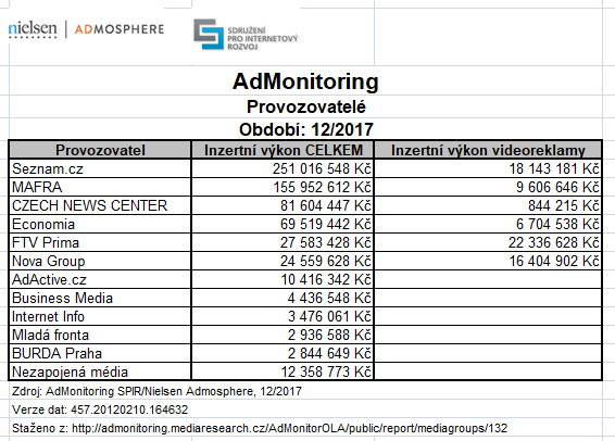 Monitoring reklamních příjmů online médií za prosinec 2017 (klikněte pro zvětšení).