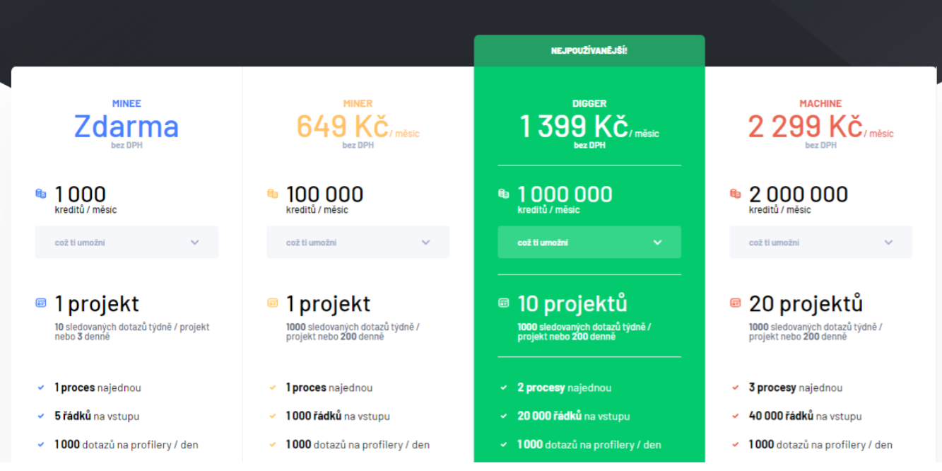 Marketing Miner je nástroj, bez kterého v SEO neudělám ani krok. Jedná se komplexní český nástroj, který vám poskytuje data o vašem projektu, která byste často jinak špatně získávali. Dokáže měřit pozice, sledovat zmínky a odchytávat nejčastější chyby. Vše probíhá v cloudu, takže si v nástroji jen zadáte, co chcete zjistit, zavřete prohlížeč a pak vám do e-mailu dojde výsledek.