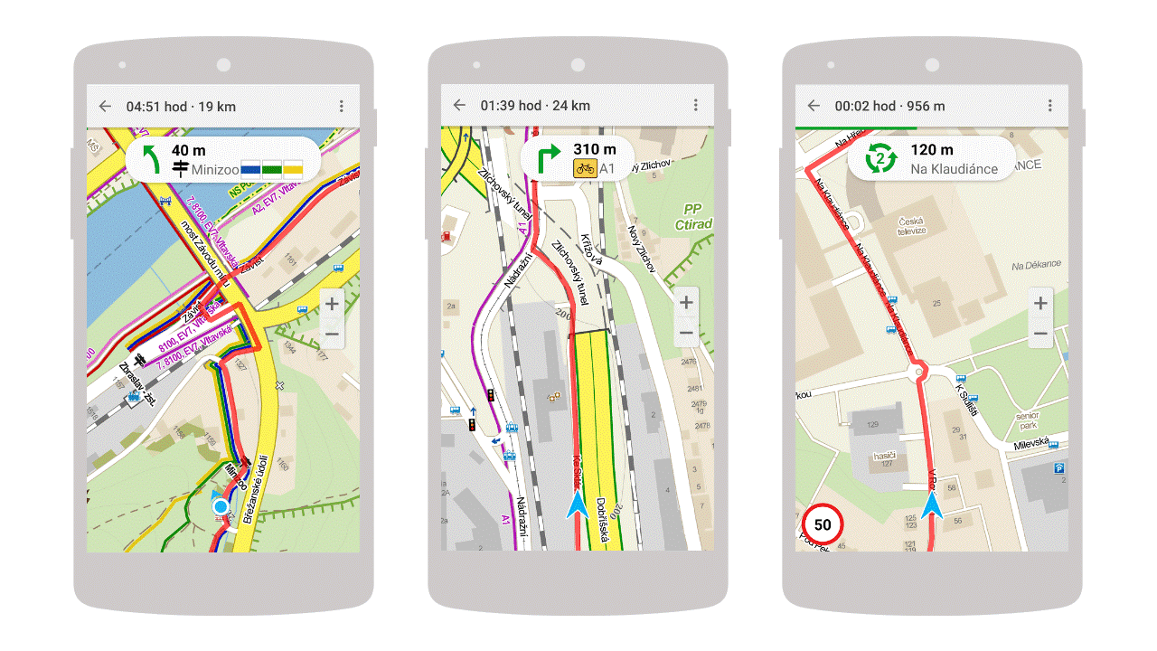Hlasová navigace upozorní na blížící se rozcestník, provede po preferované nejkratší nebo turistické trase a případně vykreslí barvy turistického značení na stezkách.