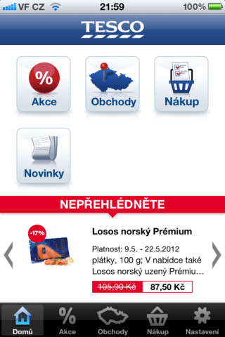 Obchodní řetězec Tesco nabízí svým zákazníkům od května mobilní aplikaci, díky níž mohou získat aktuální informace o akcích, zvýhodněné nabídce zboží, novinkách či obchodech Tesco, a to včetně vyhledání nejbližšího obchodu v okolí. Zároveň umožňuje vytvářet a spravovat jednoduché nákupní seznamy, které si uživatel může sám sestavit na základě aktuální akční nabídky.
