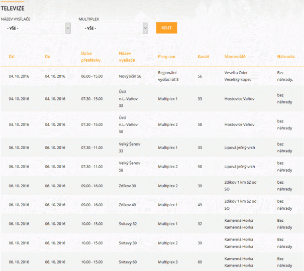 Opět to bereme kompletně a díváme se po plánovaných výlukách televizních i rozhlasových vysílačů všude možně. Nejen u Českých Radiokomunikací (ČRa), ale například i u RTI cz, Teleko či u společnosti Digital Broadcasting.