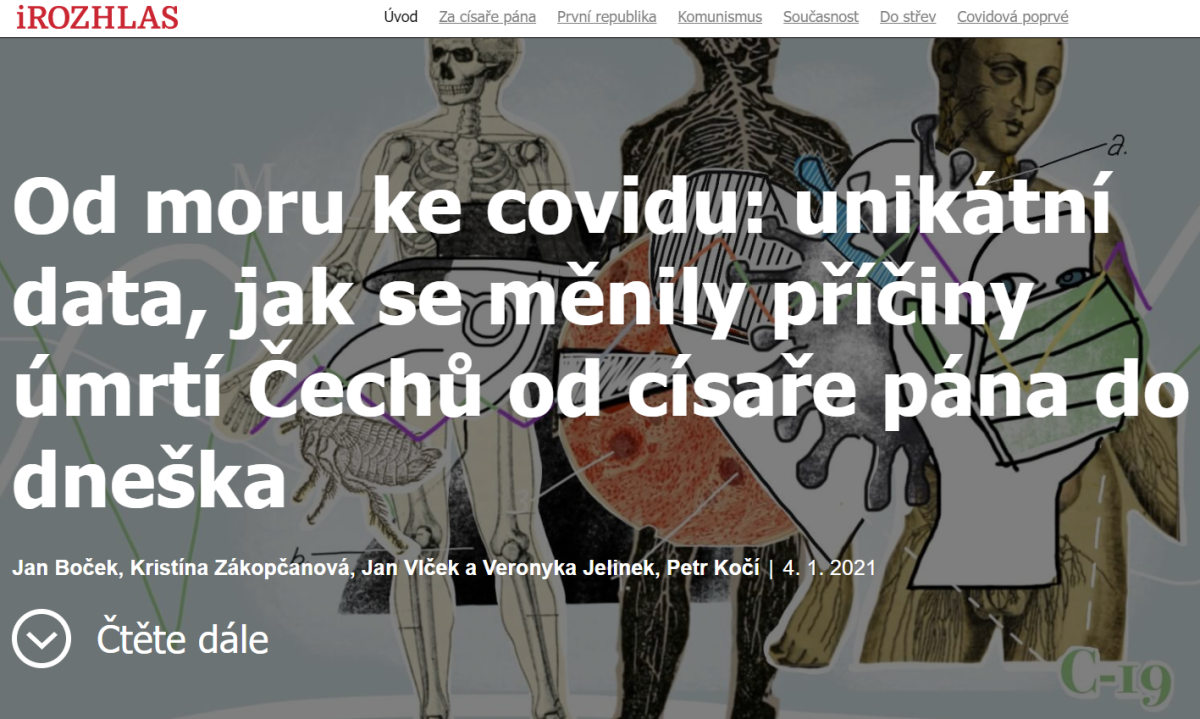 Kategorii Vzdělávání vyhrál interaktivní článek serveru iROZHLAS.cz Od moru ke covidu, který srovnává historickou statistiku příčin úmrtí mezi léty 1919–2018 s aktuální pandemickou situací.
