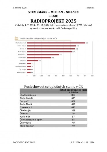 A jaké jsou konkrétní výsledky? Nejposlouchanější stanicí v České republice zůstal veřejnoprávní Radiožurnál, každý den si ho naladí 800 tisíc posluchačů. Jeho týdenní dosah se zvýšil na 1,88 milionu posluchačů. V týdenním pořadí je ale zároveň až třetí za Impulsem (2,09 milionu) a Blaníkem (2,03 milionu).