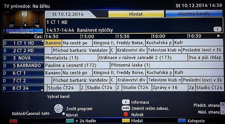Po EPG se můžete libovolně pohybovat, aniž byste byli přepnuti na kanál. Na ten se dostanete až poté co stlačíte OK na některém z pořadů. K dispozici máte dva náhledy – klasický pro sedm stanic vertikálně a výpis pořadů pro jednu stanici.