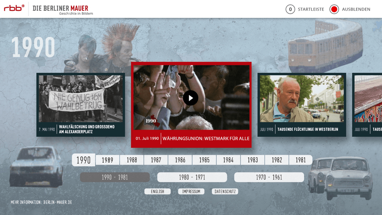 Veřejnoprávní televize a rozhlas pro oblast Berlína a Braniborska, RBB, stojí za interaktivní aplikací o Berlínské zdi. Tvůrci vybrali v archivu 250 videozáznamů od stavění zdi v roce 1961 až po znovusjednocení Německa v roce 1990. Právě výroční den spojení východního a západního Německa – 3. říjen – se před pěti lety stal okamžikem spuštění aplikace v HbbTV. Diváci také mohli přes obrazovku přidávat své komentáře a dojmy ze speciálního vysílání k pádu zdi.