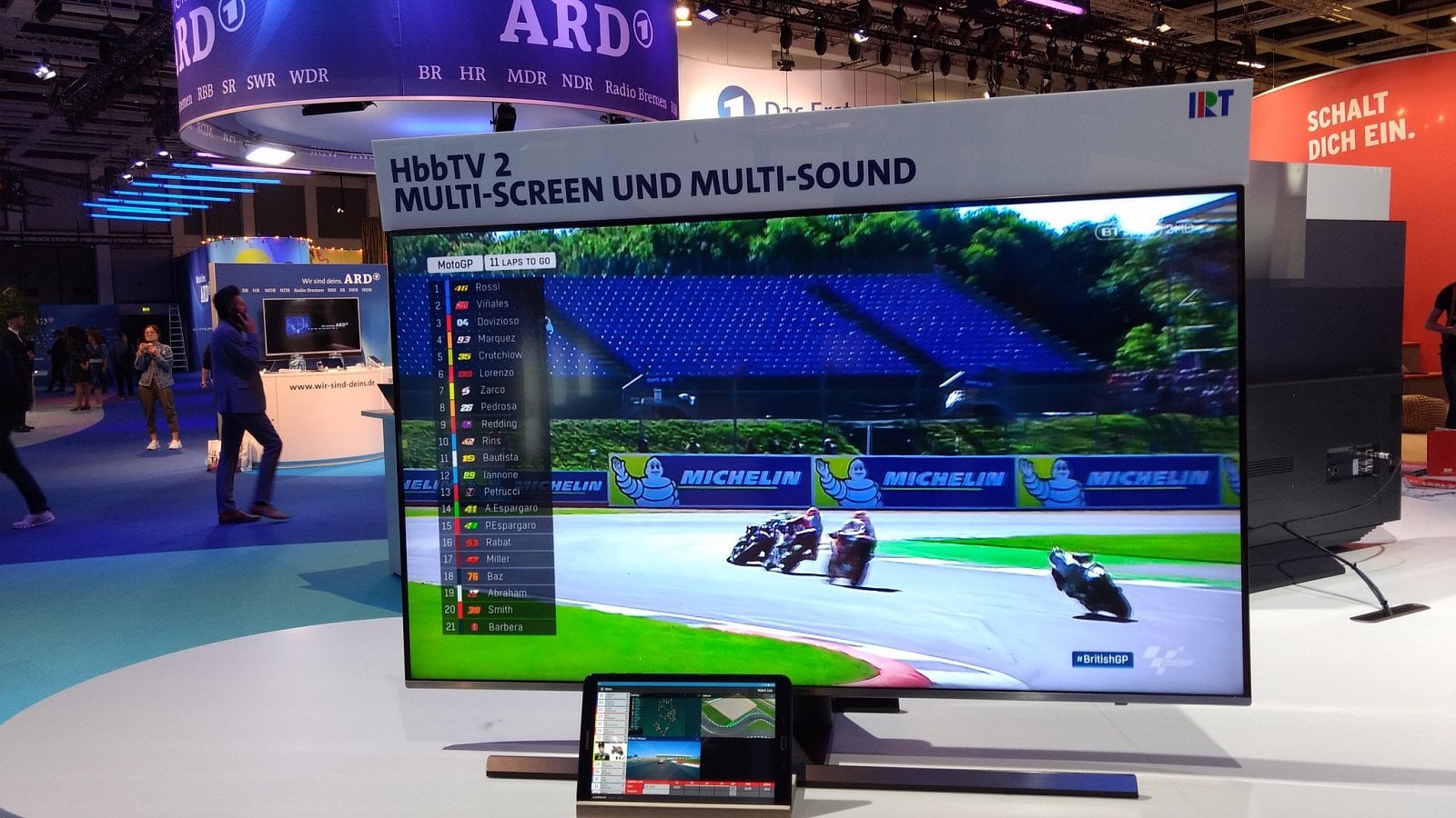 Interaktivní funkce je tedy možné vyvolat buď na televizním ovladači přes HbbTV, na obrazovce mobilu, anebo v aplikaci na tabletu. Porotu HbbTV Awards nadchlo demo aplikace propojené s přenosem závodu MotoGP, které umožňovalo přepnout na kameru zabudovanou ve stroji konkrétního jezdce, zpětně přehrávat některé úseky nebo si prohlížet doplňující informace.