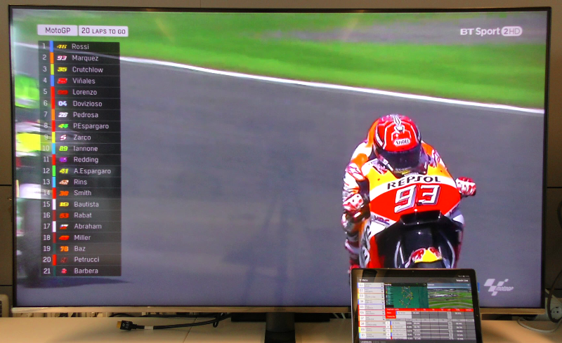 MotoGP multiscreen. Přímý přenos je synchronizován v televizi i na tabletu. Přes tablet je možné vyvolat doplňující informace nebo vybrané záznamy na televizní obrazovku.