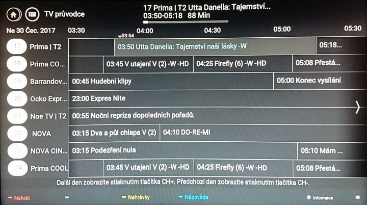 Po programové nabídce se můžete volně pohybovat, vyskočíte z ní buď opětným stlačením Guide, nebo Return či TV/Exit. Jde to i zmáčknutím OK na libovolném pořadu. Následně jste totiž přepnuti na příslušný kanál.