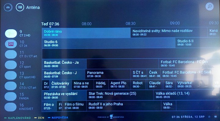 EPG je pouze se zvukem a obraz zcela chybí. Ve spodní části stránky najdete drobným písmem napsáno „Powered by Gracenote“. Data nicméně – jak je u značky Philips zvykem – mohou pocházet buď z internetu, což bylo nastaveno standardně, nebo z TV vysílače. Po přepnutí se sice náhled EPG nezmění, ale ztratí se zvuk a někdy se také mohou změnit výstupy, resp. přijímané stanice (u Gracenote jich bývá méně).