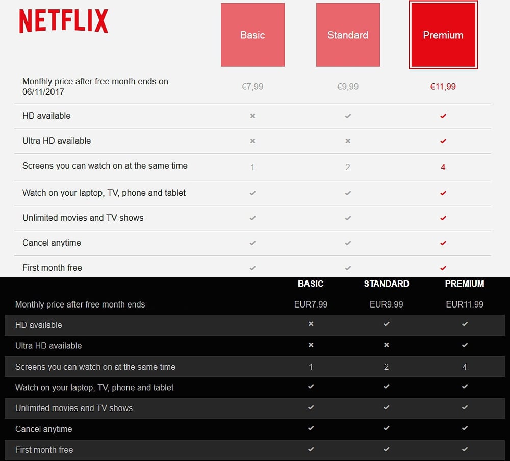 - Premium: pro 4 přístroje v HD a UHD (přehrávání na 4 zařízeních současně v HD i UHD kvalitě, pokud je k dispozici)