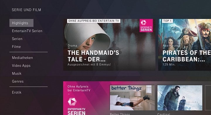 Pod názvem EntertainTV Serien se skrývají dvě věci. Kromě několika televizních seriálů, dostupných pouze u EntertainTV, je to hned celá sekce menu nazvaná Serie und Film, která nahrazuje původní On Demand.