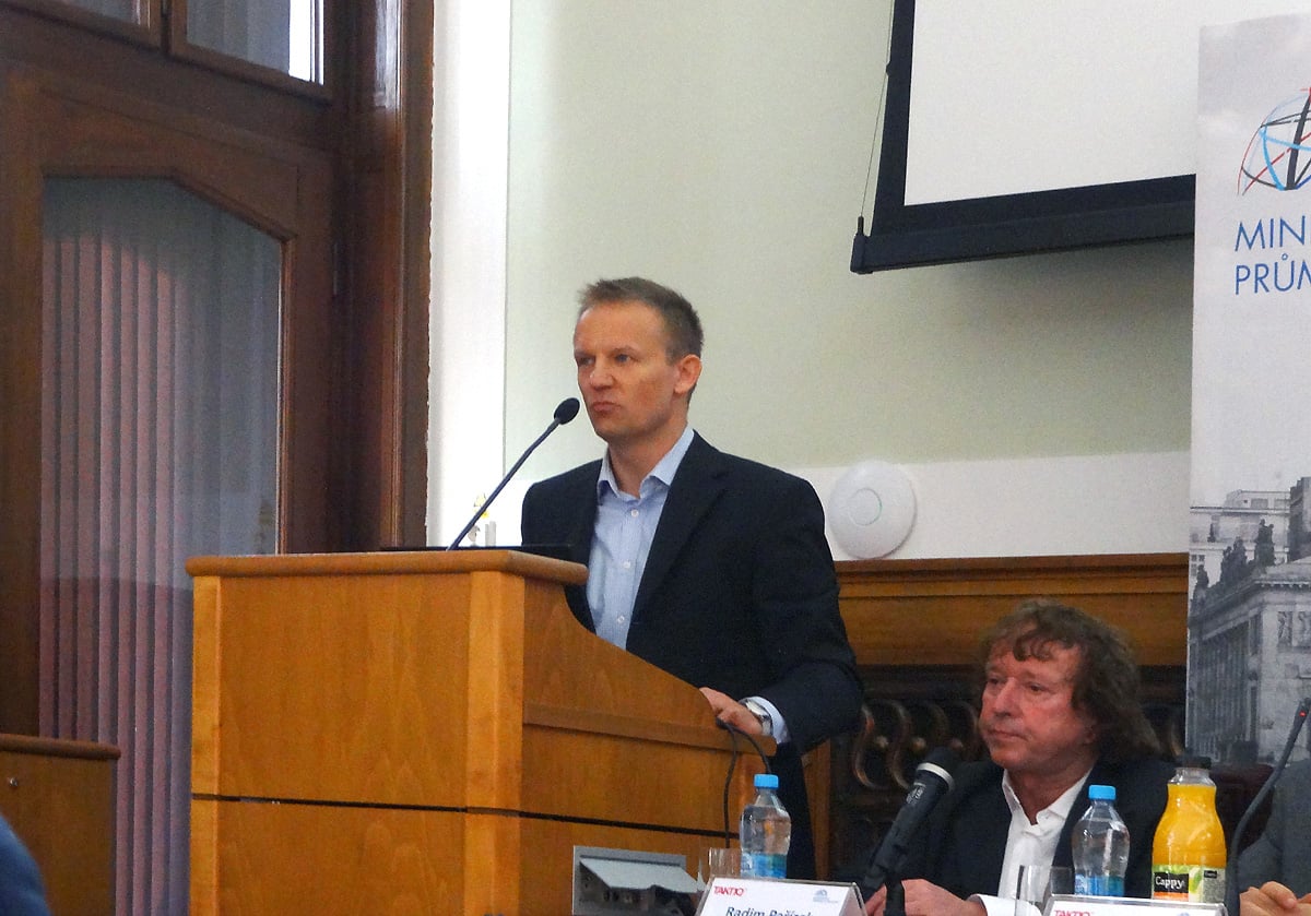 Vystoupení Martina Gebauera, generálního ředitele Českých Radiokomunikací, sleduje Radim Pařízek, jednatel společnosti Digital Broadcasting.