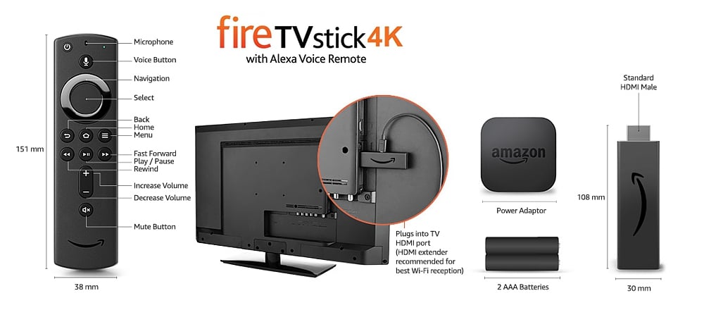 - Dálkový ovladač s dedikovanými tlačítky pro Amazon Prime, Netflix, HBO, Playstation Vue a zabudovaným mikrofonem (podporuje asistentku Amazon Alexa)