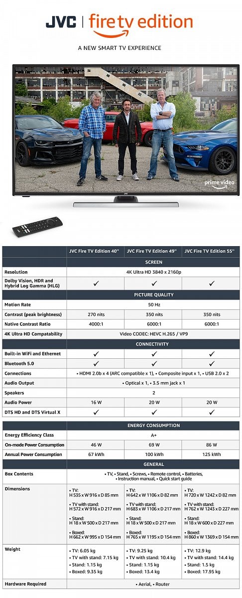Z britské nabídky si představíme 49" 4K UHD HDR LED TV značky JVC, model LT-49CF890. V distribuci (exkluzivně Currys PC World) jsou ještě modely s úhlopříčkou 40" a 55". Srovnání modelů v tabulce níže: