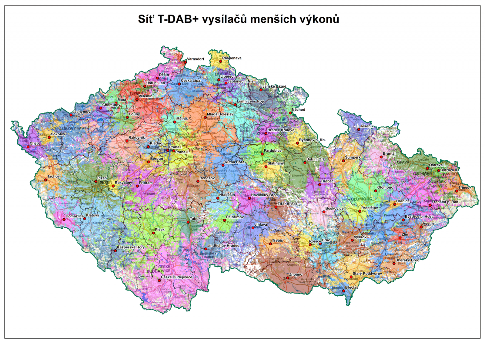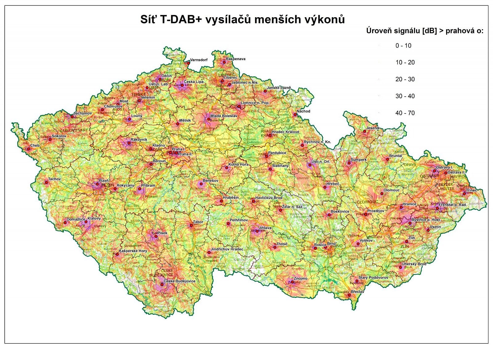 Pro představu, jak by mohla vypadat DAB+ síť nového operátora, jsem posbíral některé stávající lokality využité pro VKV-FM, aktuální DAB+ i vysílání DVB-T/2 a provedl simulaci jejich pokrytí za pomoci radioamatérského softwaru. Síť obsahuje i „výherní“ lokality, jako jsou například Klínovec, Milešovka, Černá hora v Krkonoších, Kleť nebo Klatovy-Doubrava. Dominanci pokrytí jednotlivých vysílačů označují v mapkách různé barvy. U většiny z přibližně 70 lokalit jsem uvažoval vyzářený výkon 1 kW, u vybraných pak 5 kW.