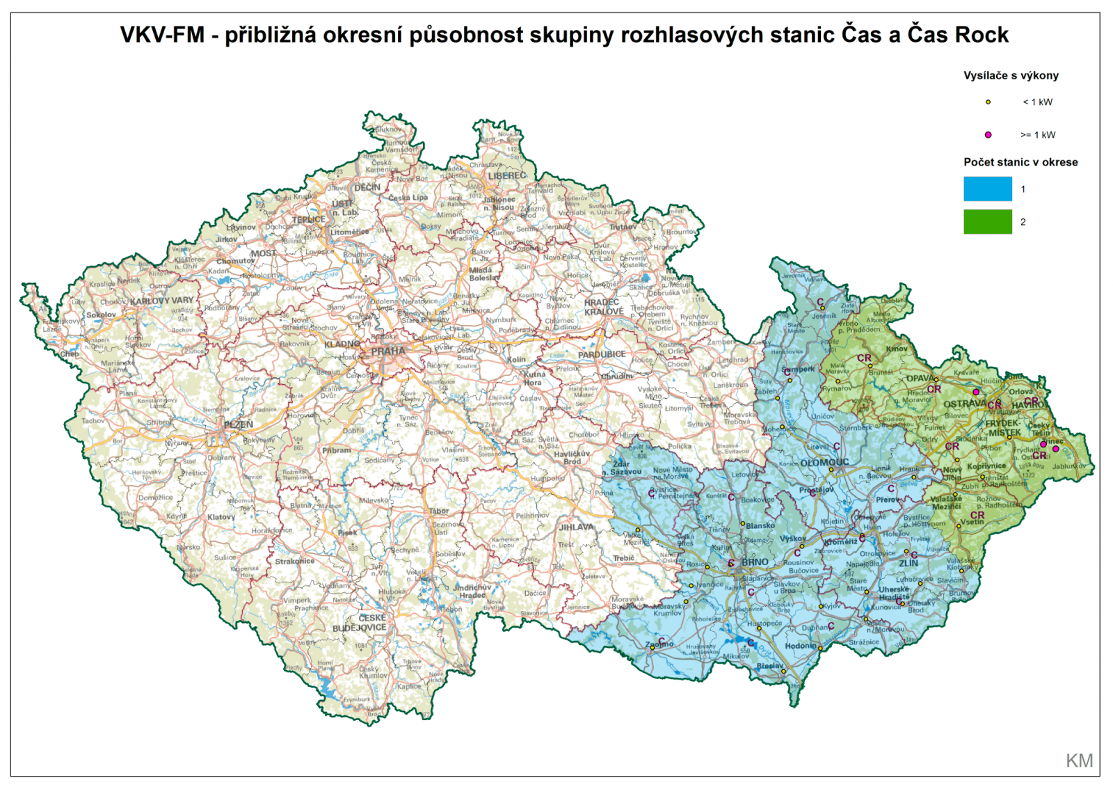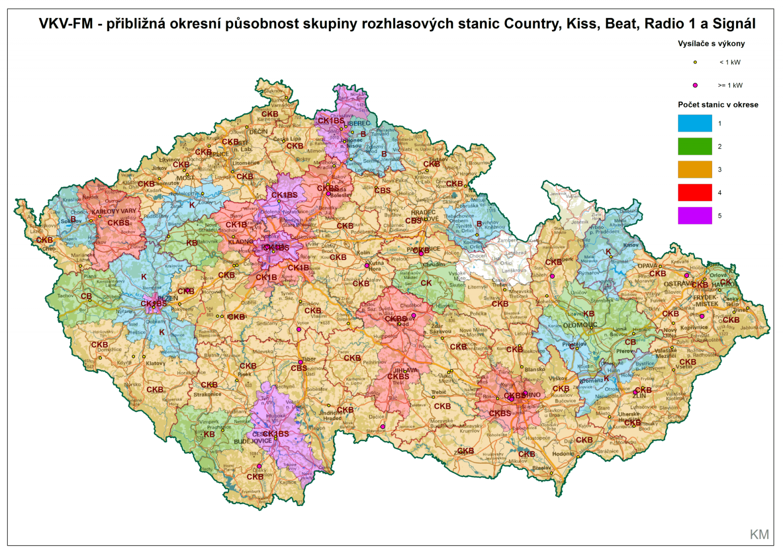 Následující mapky ukazují působnost stanic největších mediálních domů a vysílací lokality v jednotlivých okresech. U výkonnějších vysílačů je počítáno s možností přesvitu do okolních okresů dle zkušeností autora. Jednopísmenné zkratky označují konkrétní stanice, příslušnost písmene ke stanici by měla být intuitivní.
