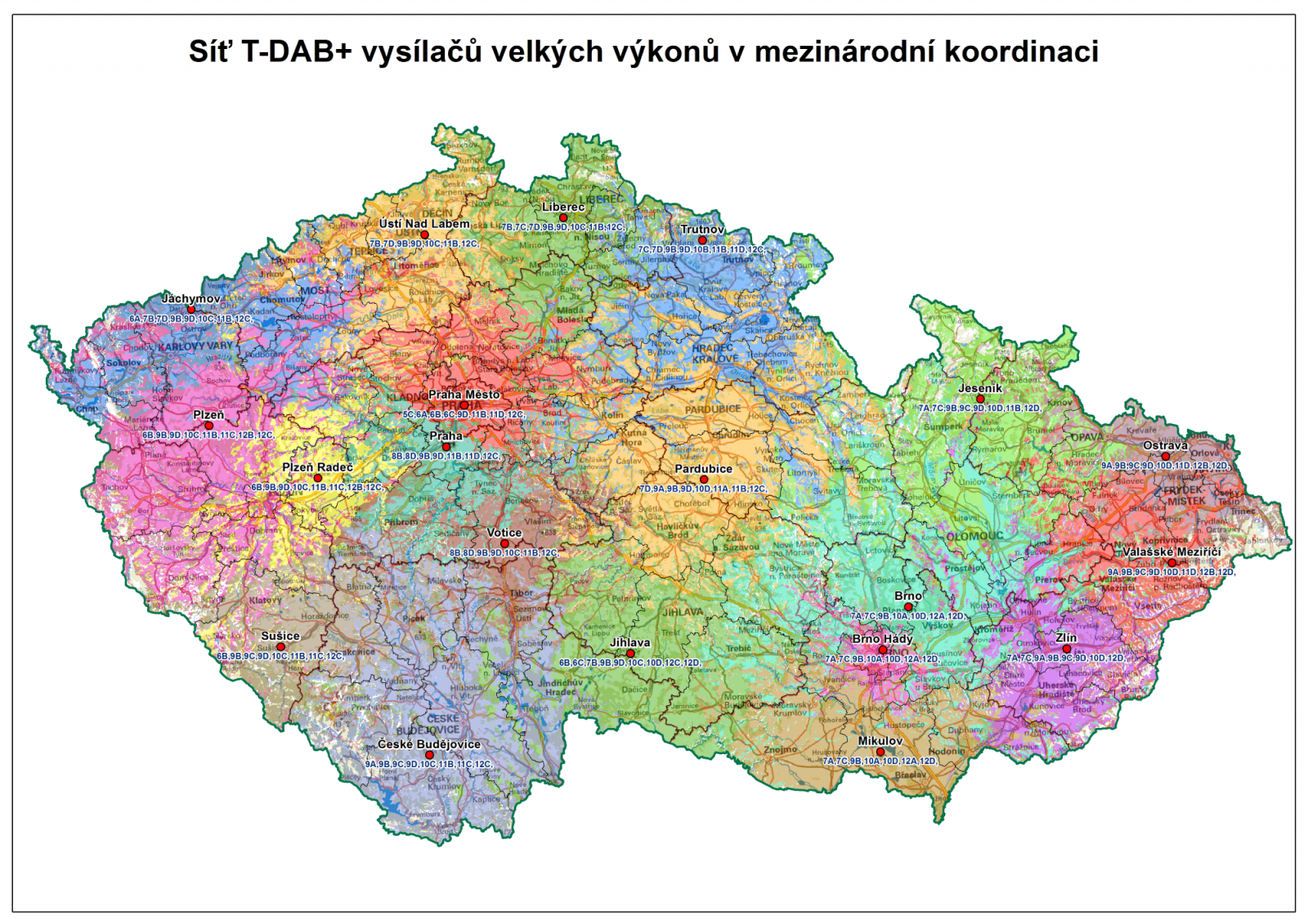 Zmíněné koordinace směřovaly na nejkritičtější umístění vysílačů z pohledu maximálního použitelného vyzářeného výkonu i radiové viditelnosti z vysílací věže. Vyzářené výkony nabývají 10 nebo 20 kW, často se směrovými omezeními k hranicím ČR.