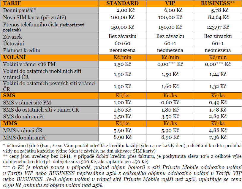Private Mobile nabízí tři tarify. Pozoruhodně zavádí jakýsi „denní paušál“, který se odečte za každý den, po který je SIM aktivní.