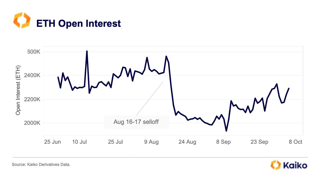 Otevřený zájem (množství otevřených kontraktů) u perpetuálních futures na ETH od začátku září naopak rostl. Takzvaná funding rate, tedy sazba, která představuje rozdíl mezi cenou na trhu s perpetuálními futures a cenou indexu, jenž odpovídá spotovému trhu podkladového aktiva, zůstávala neutrální, a místy se dokonce propadla do záporu. To naznačuje, že trh aktuálně postrádá jasný směr.