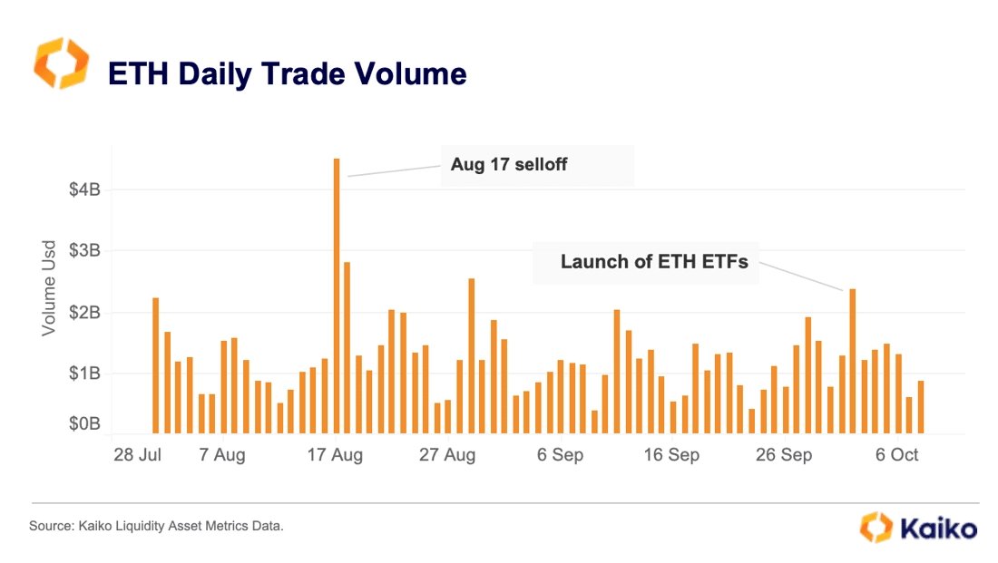 Druhou a významnější událost pak představuje uvedení prvních amerických ETF založených na etherových futures kontraktech. Americká Komise pro cenné papíry a burzy (SEC) proti svým zažitým zvyklostem totiž schválila šestici ETF (veřejně obchodovaných fondů) založených na etherových futures dříve, než se očekávalo, a ty se tak začaly obchodovat již v minulém týdnu. I když by se mohlo zdát, že jde o veskrze pozitivní záležitost s kladným dopadem na cenu, realita zase tak černobílá není. Hlavní skvrnou na slunci je nezvykle vlažný debut etherových ETF.