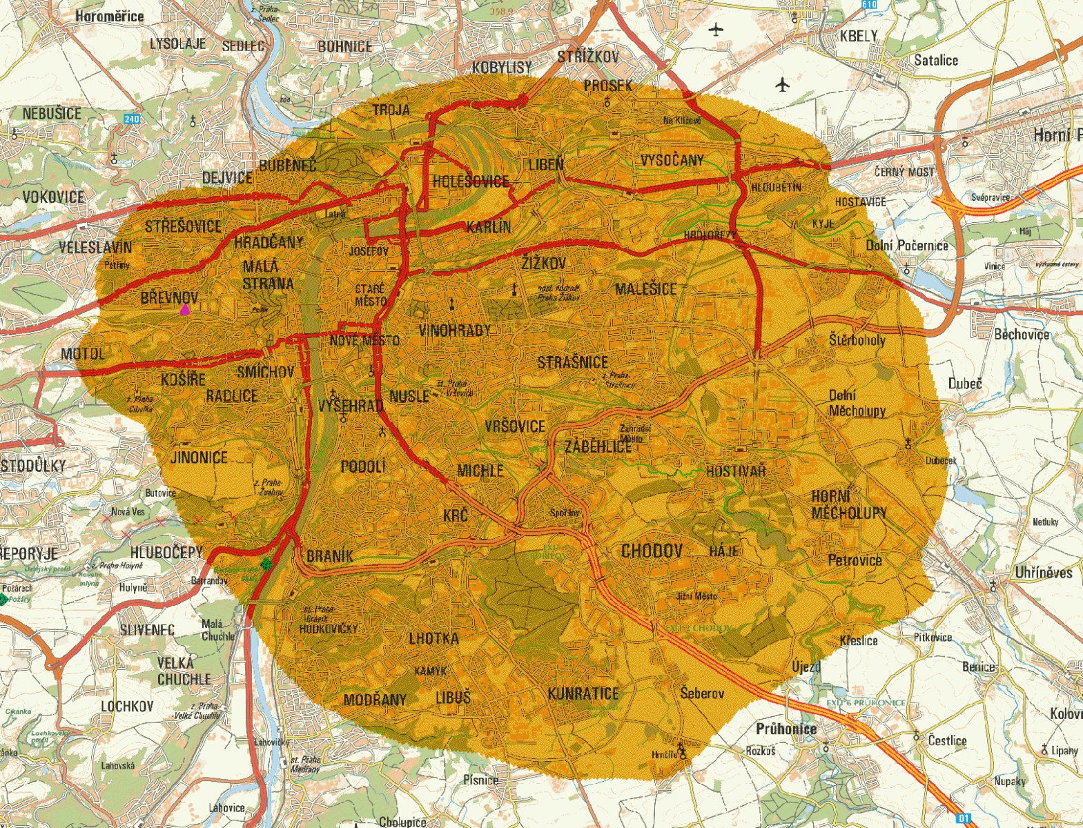 Pokrytí pilotního rozhlasového digitálního multiplexu Českých Radiokomunikací v Praze, v němž se Český Impuls objeví od 31. července (kliknutím mapku zvětšíte)