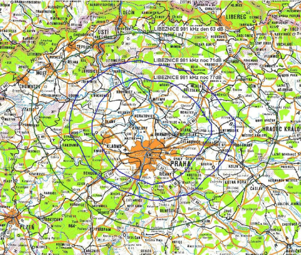 Předpokládaný dosah středovlnného vysílače Českého Impulsu v Líbeznicích u Prahy