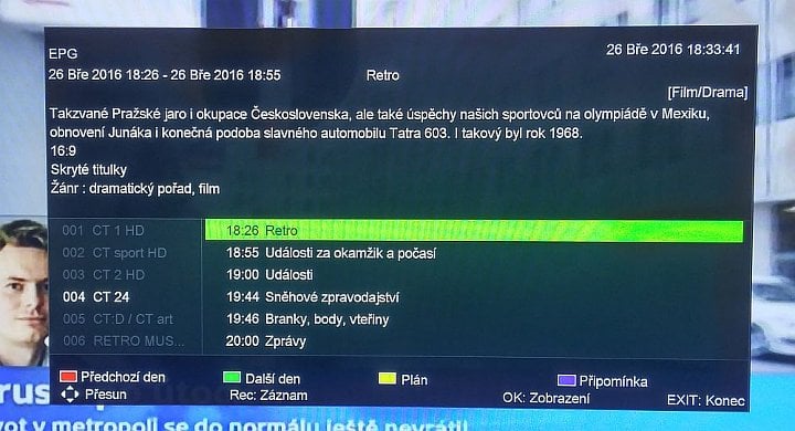 Po programové nabídce se můžete libovolně pohybovat, dokud nezmáčknete OK. Pak jste na stanici přepnuti. A protože se i náhled EPG objevuje ve zmenšeném okně, na pozadí vidíte obraz a slyšitelný je i zvuk. K vybranému pořadu vidíte zároveň i podrobný popis, můžete si pro něj naplánovat nahrání nebo se na něj nechat upozornit. Televizor se ale z pohotovostního režimu nikdy neprobudil.