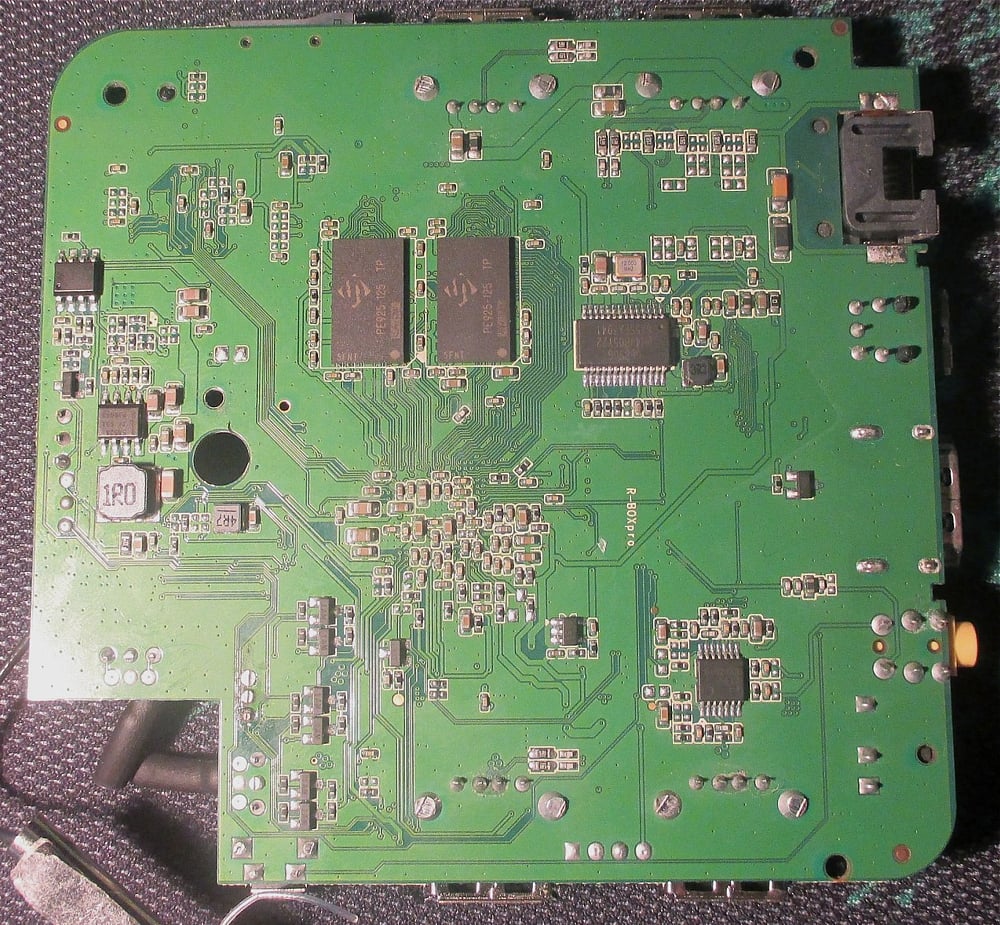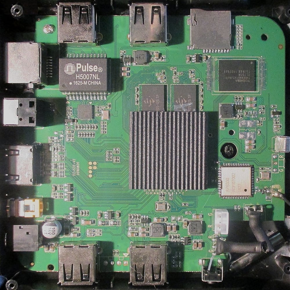 Dále zleva doprava: 100 / 1000 LAN magnetics Pulse H5007NL, pod ním LAN chip / transceiver Realtek RTL8211F, 2 bloky pamětí DDR3 RAM od společnosti SpekTek a pod heatsinkem schovaný CPU Amlogic S912. Napravo nahoře flash paměť Toshiba a nakonec napravo dole modul pro bezdrátové spojení Ampak AP6330 (Wi-Fi 802.11 b/g/n a Bluetooth 4.0).