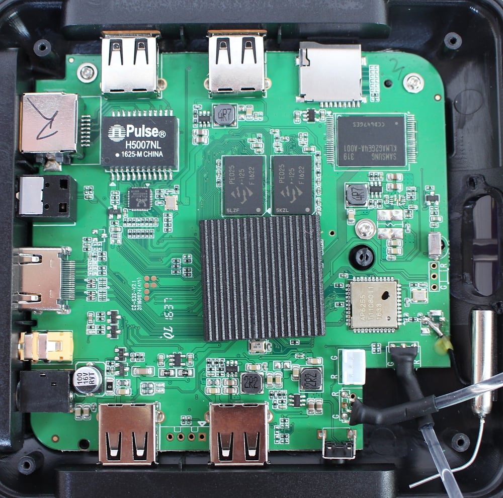 Dále zleva doprava, většina komponentů je již známa z předchozích fotografií: 100 / 1000 LAN magnetics Pulse H5007NL, pod ním LAN chip / transceiver Realtek RTL8211F, 2 bloky pamětí DDR3 RAM od společnosti SpekTek a CPU Amlogic S912, zde s odstraněným heatsinkem. Napravo nahoře flash paměť Samsung, tentokrát KLHBG4GEAC-B031 s kapacitou 32 GB a napravo dole modul pro bezdrátové spojení, Fn-Link 8223A-SR (Wi-Fi 802.11 b/g/n/ac a Bluetooth 4.1).