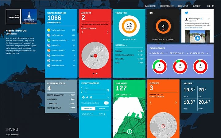 Pro občany vznikl takzvaný „city dashboard“. „Je to takový IDOS pro Izmir, ve kterém jsou zahrnuty i trajekty,“ přibližuje Duffek. V aplikaci je možné vidět i pozici přijíždějícího autobusu a další podobné funkce. Lidé ale také po městě chtěli, aby v aplikaci bylo možné vidět i lékárny, které mají otevřeno nonstop, a město tedy funkci přidalo.