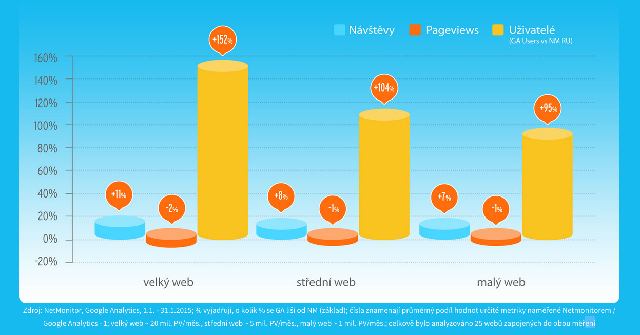 Google lechtá ego provozovatelů stránek mnohem víc než NetMonitor. Podle experimentu Sdružení pro internetový rozvoj se během tříměsíčního sledování obě metriky víceméně sejdou v případě page views a s trochou dobré vůle i u návštěv, kde Google přidává přibližně deset procent.