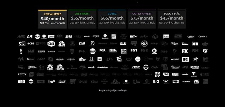 Služba DirecTV Now nabízí pět základních tarifních balíčků – 4 anglické + 1 španělský, každý s vlastním označením: