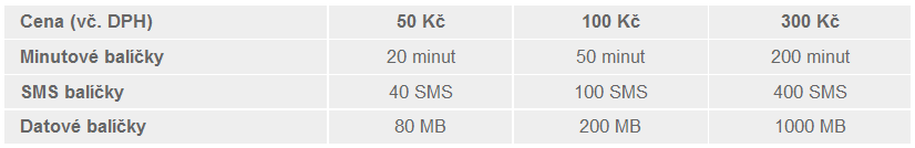 Kromě volání a SMS si bude v balíčcích možné nadefinovat i data, možnosti jsou tři: 80 MB za 50 Kč, 200 MB za 100 Kč nebo 1 GB za 300 Kč.