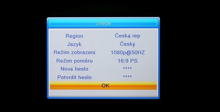 Zprovoznění je – jak už to u podobných zařízení bývá – prajednoduché. Na obrazovce se po zapnutí objeví tabulka, kde jen zkontrolujeme zemi a jazyk příjmu (přednastaveno Česko a čeština) a můžeme změnit režim zobrazení (od 480i až po 1080p/50 či 60 Hz, případně ho přenechat automatice). Upravit lze i poměr stran obrazu. Z důvodu, který mi poněkud uniká, musíme zadat i čtyřmístné numerické heslo. Po potvrzujícím „OK“ se už rozeběhne automatické ladění dostupných stanic, samozřejmě včetně rozhlasového „přívažku“.