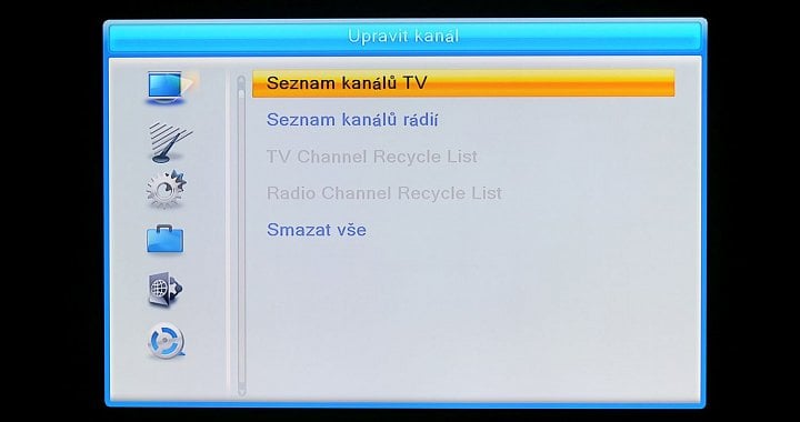 Menu přijímače má celkem šest oddílů: Upravit kanál, Instalace, Nastavení systému, Nástroje, Síť a Přehrávač médií. Už první položku nejspíše použijeme hned po vstupní instalaci. Zde je totiž dostupná úprava televizních a rozhlasových kanálů, přesněji jejich seznamu. Jednotlivé položky lze přesouvat na požadované pořadí, zadat jejich „uzamčení“ (pro aktivaci je pak nutné zadat zmíněný PIN) či přeskočení; po mém soudu zcela zbytečná funkce, kdy se stanice nezobrazuje při sestupné/vzestupné volbě tlačítky Prog+/Prog- na ovladači. Naopak praktická je možnost nepotřebné položky – třeba duplicitní kanály – zcela vymazat. Může se hodit i přejmenování stanice – s chutí tak mažu onu hloupou mezeru před názvem „Nova“, která má při abecedním řazení tuto stanici katapultovat na první pozici…