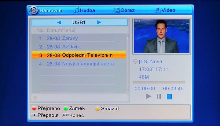 Poslední položkou menu je Přehrávač médií. Aktivní je samozřejmě jen v případě, že k přijímači připojíme externí pevný disk nebo flash paměť. Z nabídky kapitoly je bezesporu nejdůležitější hned první položka – Nahrávání. V jejím okně se zobrazují na disku uložené nahrávky, které zde kromě přehrávání můžeme také přejmenovat, vymazat či naopak proti smazání uzamknout. Samotný záznam lze spustit jak ručně – stiskem tlačítka s charakteristickým červeným bodem – tak pomocí předem naprogramovaného časovače, který je kupodivu v menu dostupný na zcela jiném místě (Nastavení systému), lze ho ale aktivovat i z programového průvodce. V jeho okně zadáme čas začátku nahrávání a délku záznamu. Kromě nahrávání lze stejný časovač využít i pro pouhé zapnutí přístroje, což pak poslouží třeba jako „televizní budík“. Takže při zadávání údajů pozor, aby bylo v položce Služba časovače zobrazeno Nahrávání, a nikoli Kanál. Trochu zavádějící může být, že stanici, kterou chceme nahrávat, nastavujeme v položce Kanál buzení.