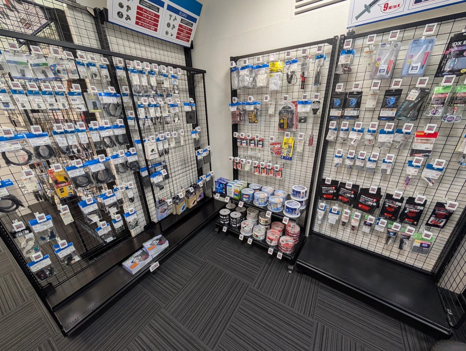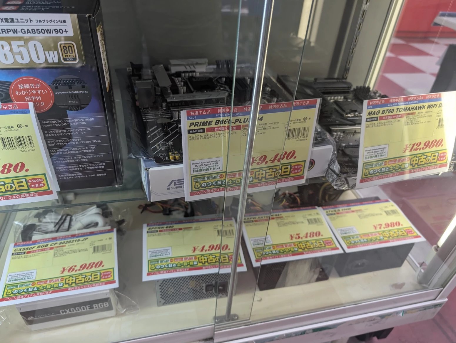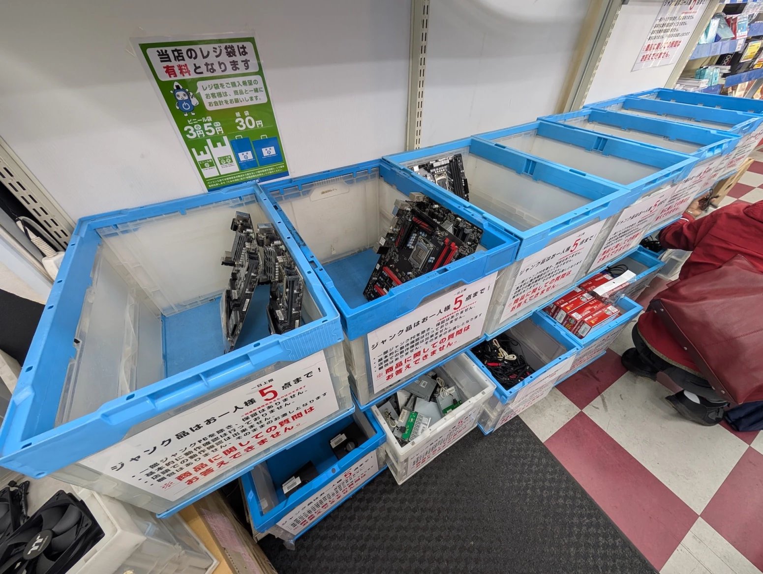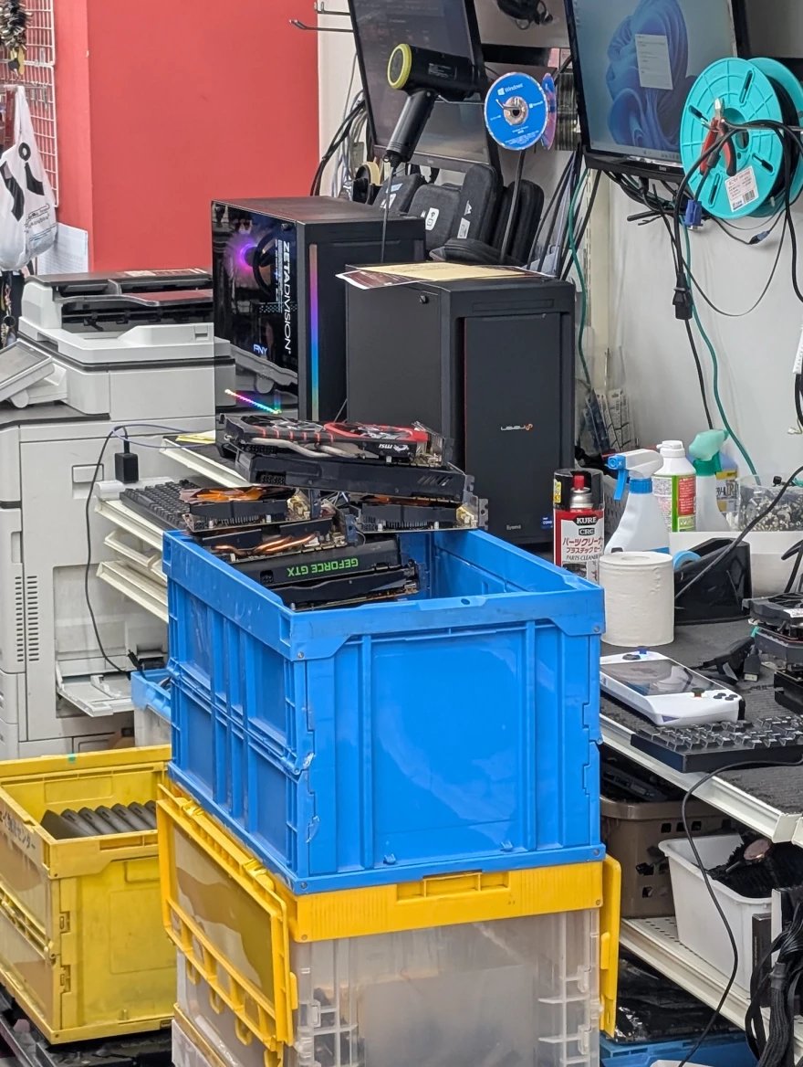 Japonské počítačové obchody zároveň nabízí zboží z druhé ruky. Některé se na něj vyloženě specializují. Prodavači ho testují, čistí a repasují. Na místě si tak můžete koupit třeba použitý procesor nebo grafiku, případně se lze přehrabovat ve starých větrácích a dalších komoditách.
