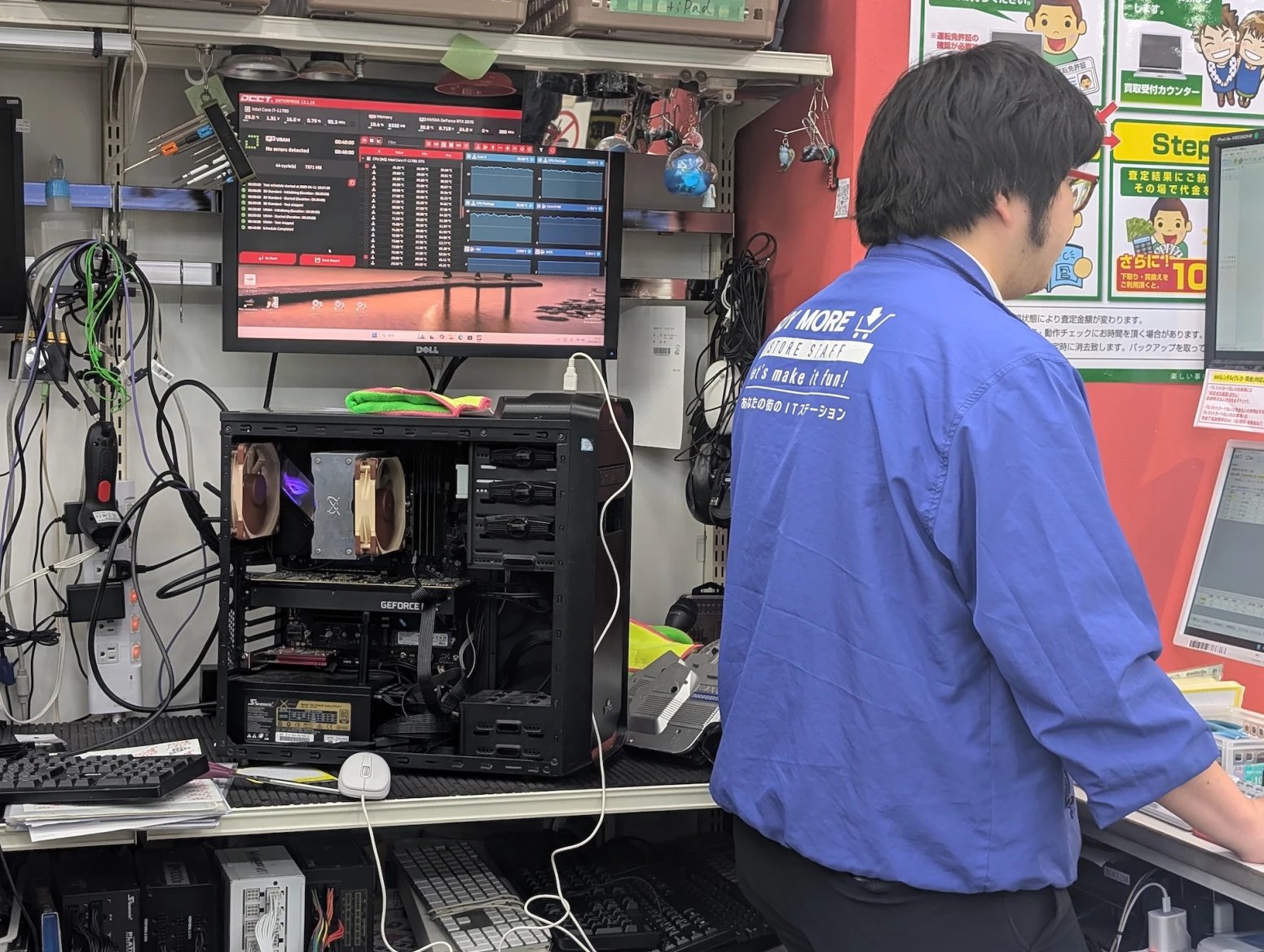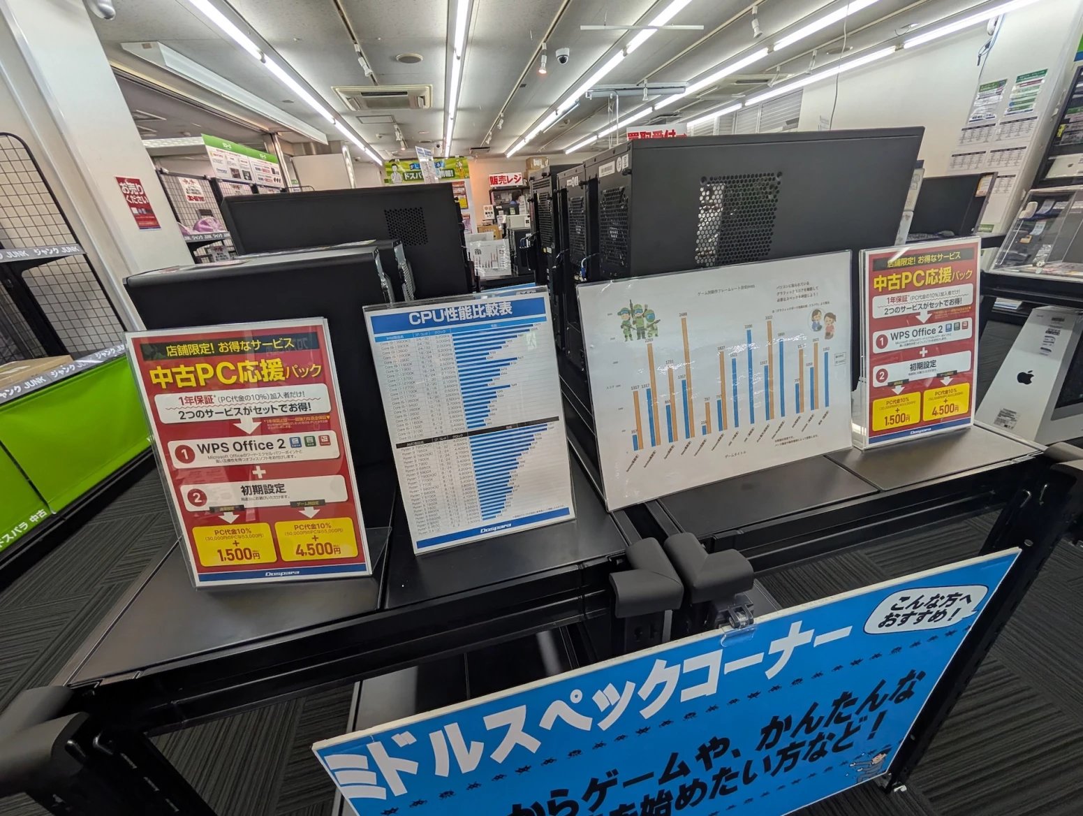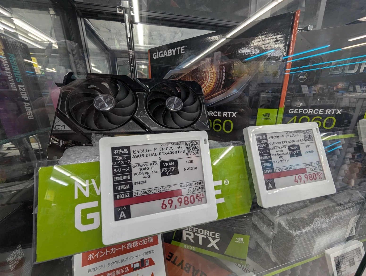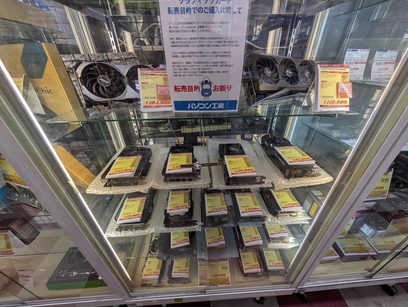 Japonské počítačové obchody zároveň nabízí zboží z druhé ruky. Některé se na něj vyloženě specializují. Prodavači ho testují, čistí a repasují. Na místě si tak můžete koupit třeba použitý procesor nebo grafiku, případně se lze přehrabovat ve starých větrácích a dalších komoditách.