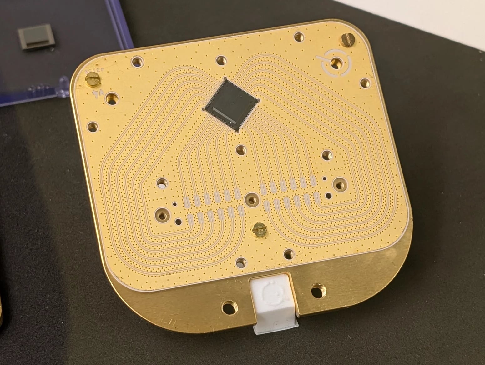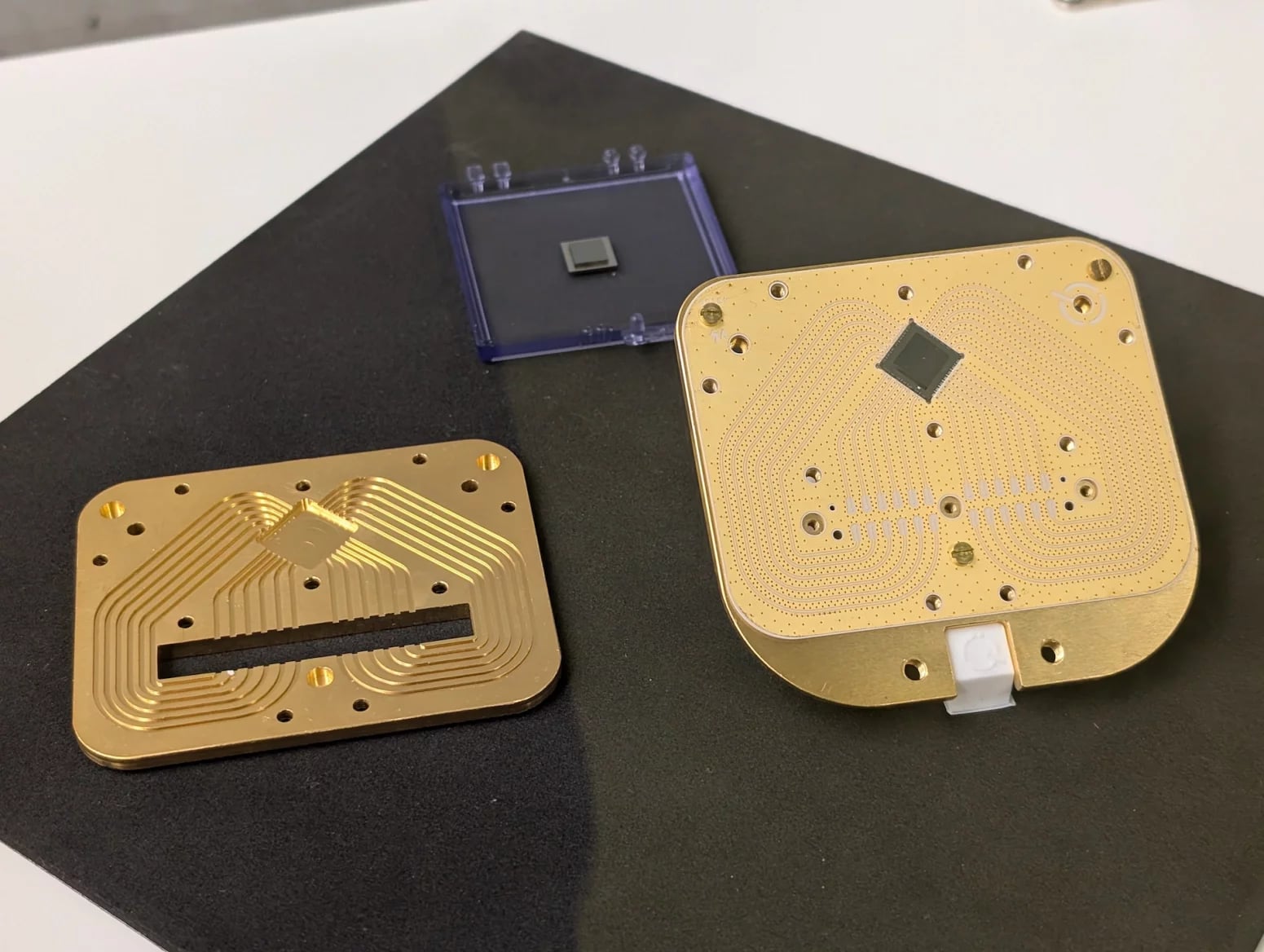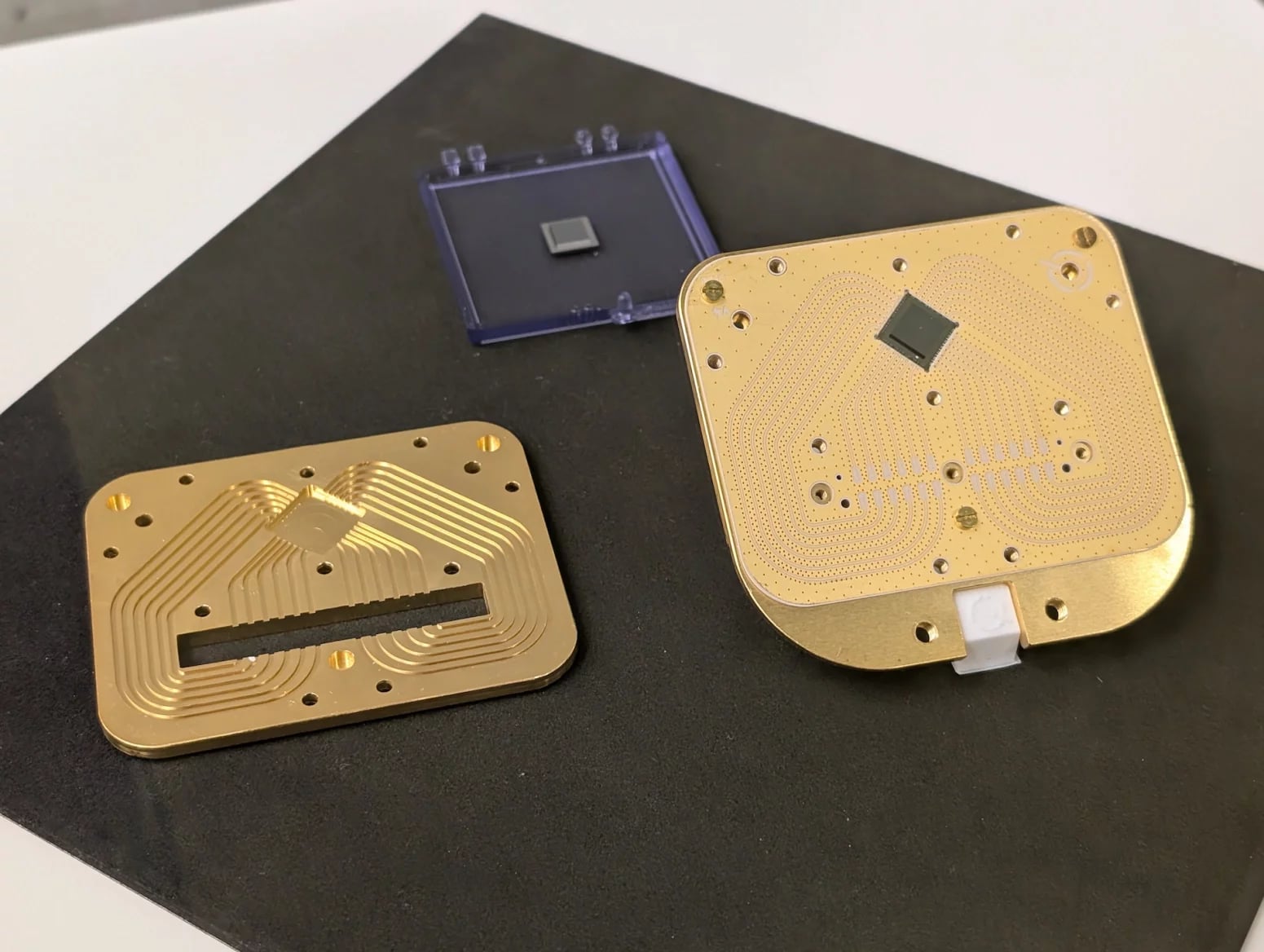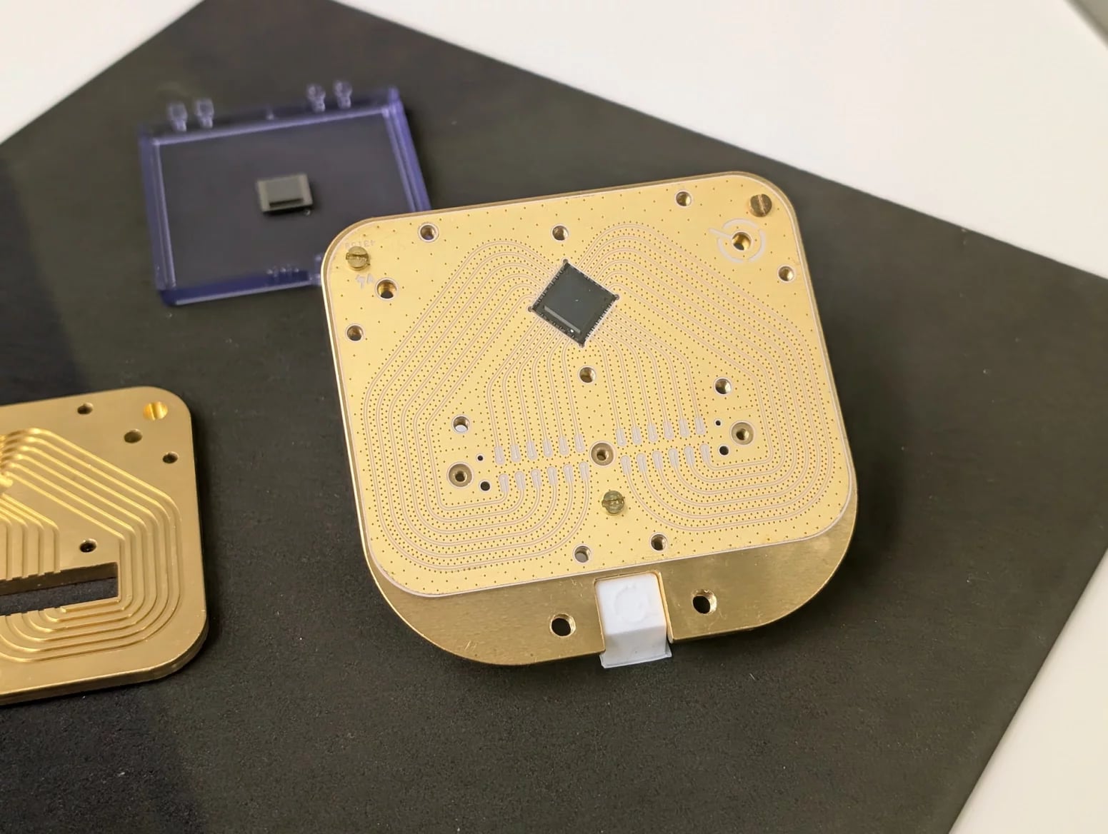 Samotný čip bude dodán a instalován později, pravděpodobně v září. V naší galerii nicméně můžete vidět jeho ukázkový vzorek. Nepoměr je do očí bijící. Samotný čip je miniaturní (černý čtverec) a zlatá konstrukce kolem něj slouží k chlazení a napojení na zbytek kryo systému.
