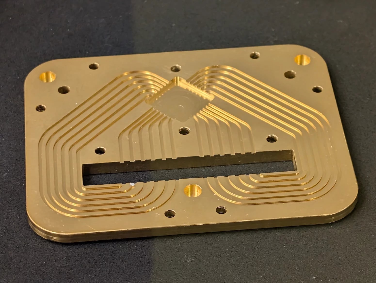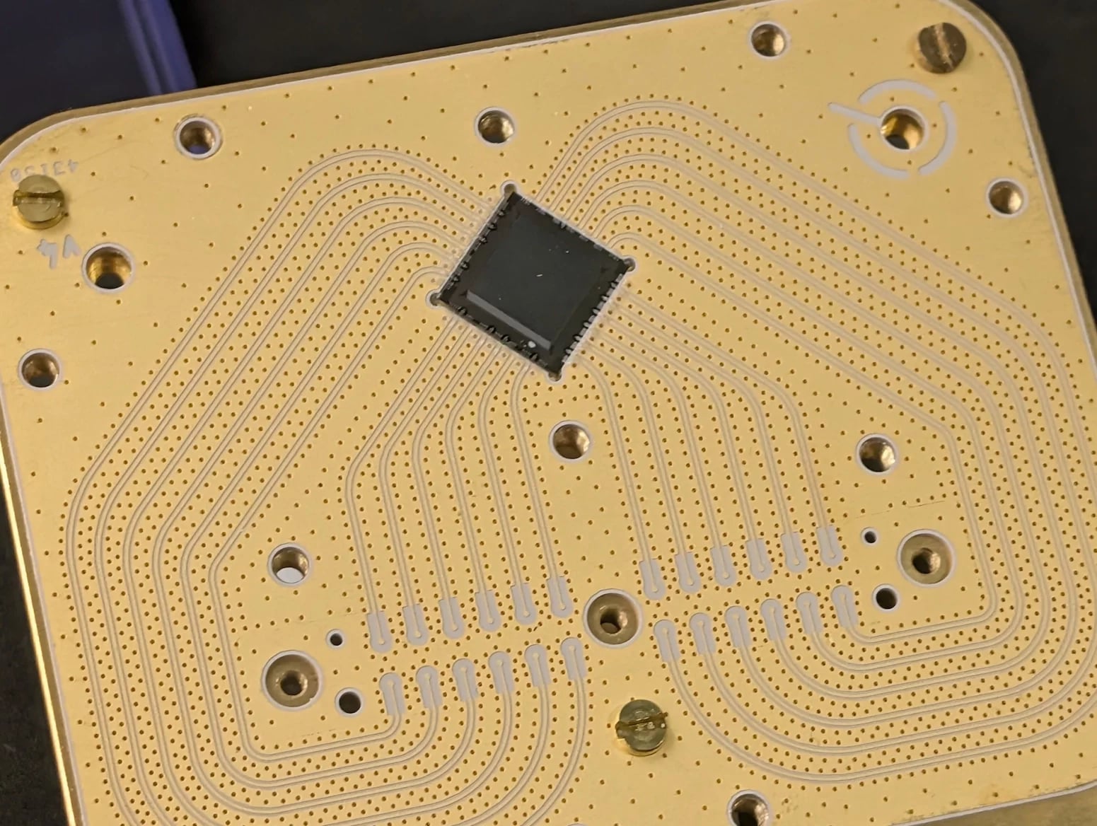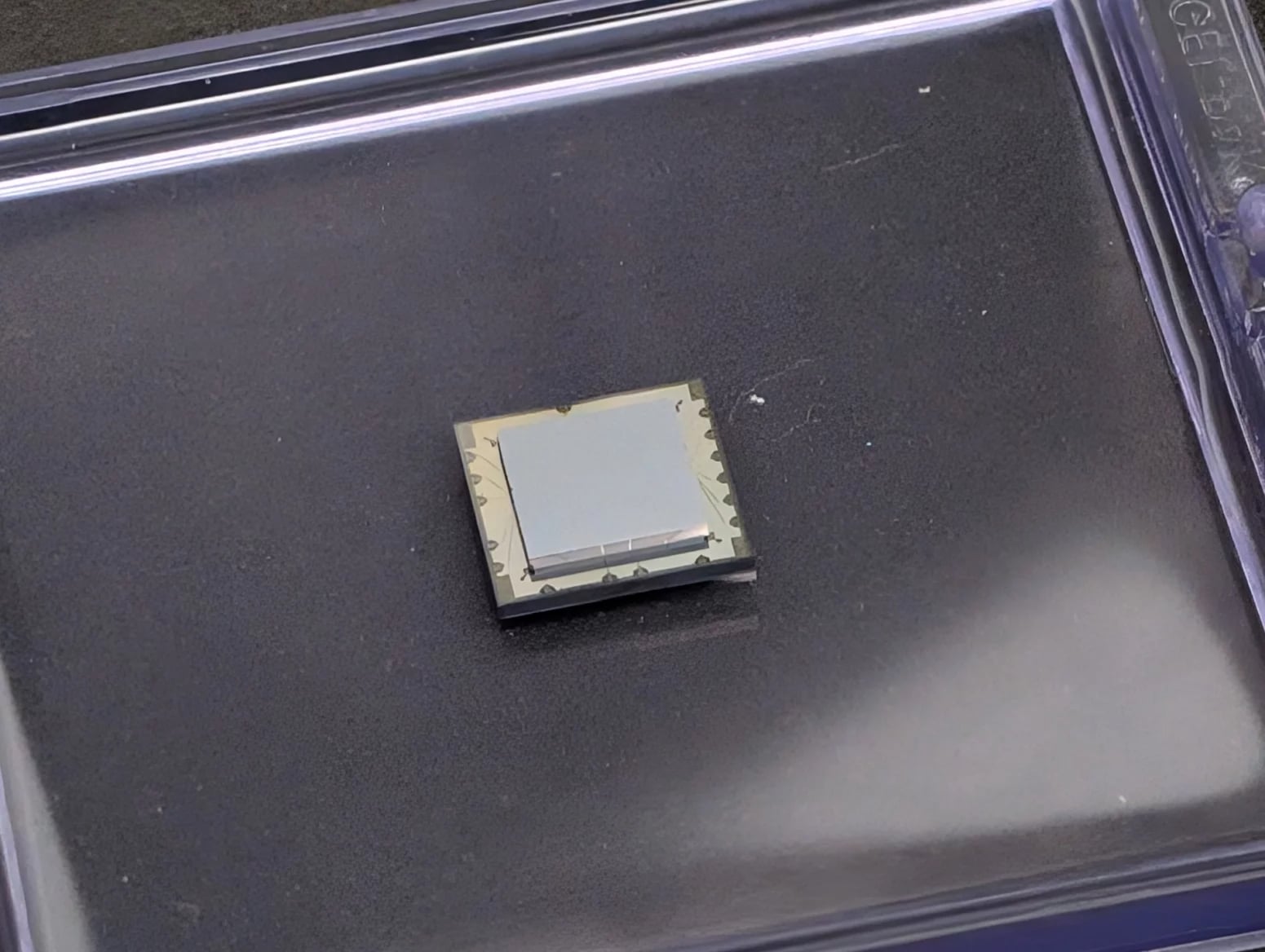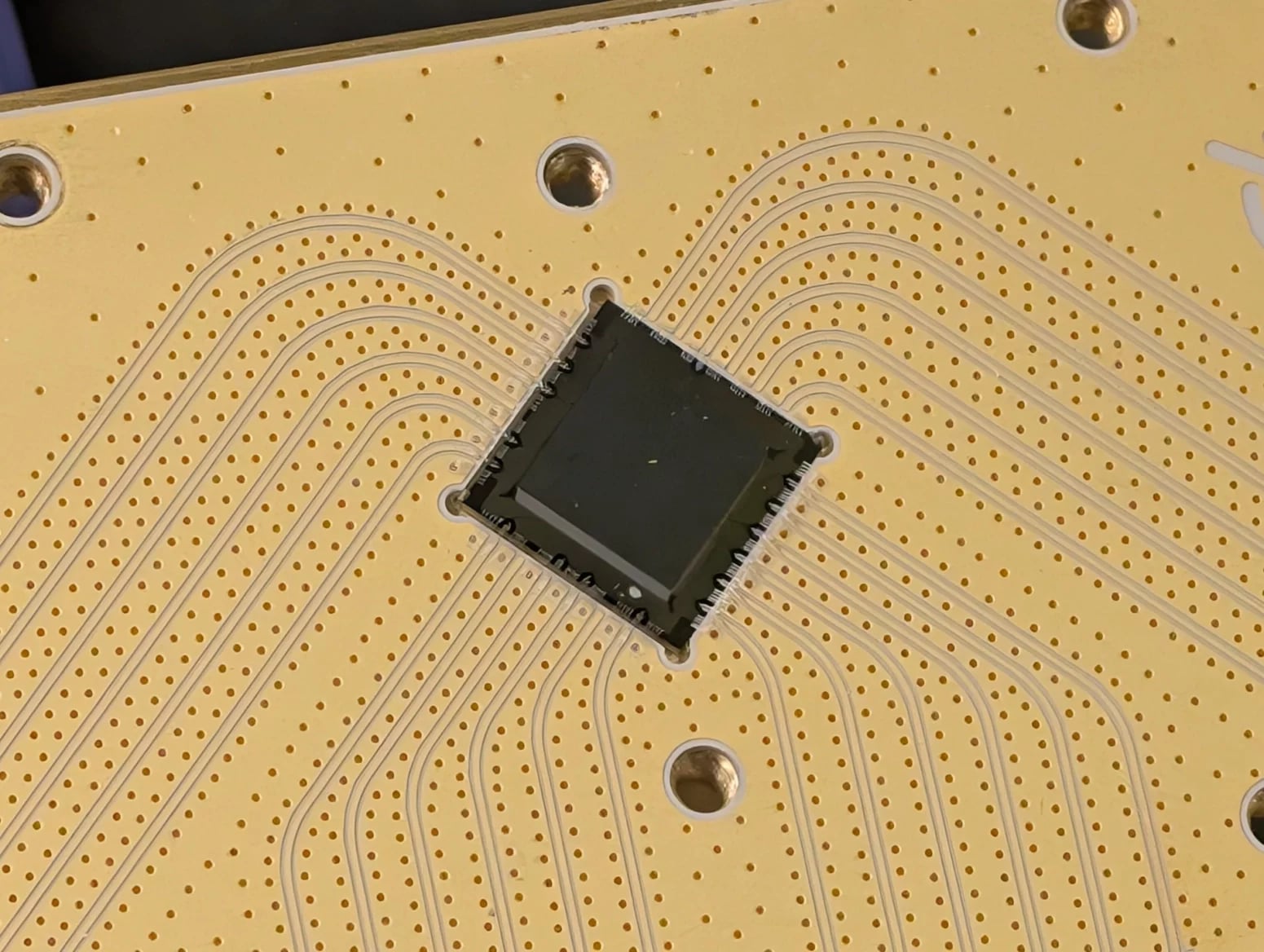 Samotný čip bude dodán a instalován později, pravděpodobně v září. V naší galerii nicméně můžete vidět jeho ukázkový vzorek. Nepoměr je do očí bijící. Samotný čip je miniaturní (černý čtverec) a zlatá konstrukce kolem něj slouží k chlazení a napojení na zbytek kryo systému.