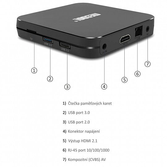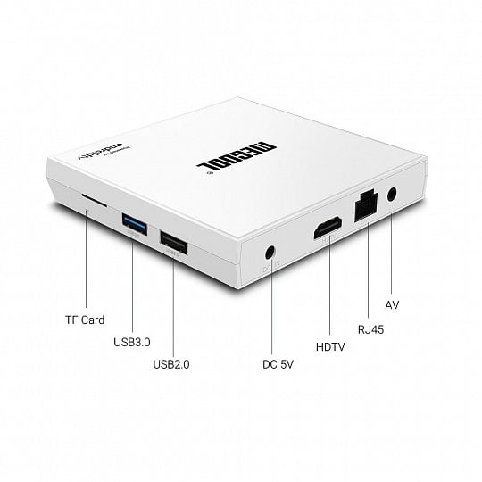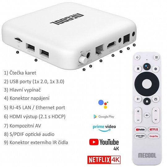 Přiložen je zjednodušený dálkový ovladač s dedikovanými tlačítky pro YouTube, Amazon Prime Video, Google Play a Google Assistant. Přístroj je osazen procesorem Amlogic S905X3 (ARM Cortex A-55) a nabízen je ve dvou verzích operačního systému, Android TV 9 a 10.