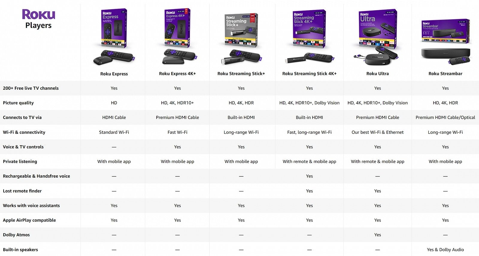 Přestože jsou noví vlastníci dle většiny pochvalných reakcí velmi spokojeni až nadšeni, jde spíše o ukázku skvělého marketingu. Ve skutečnosti se totiž jedná o upravený model Roku SE (3903), nabízený místo tradiční černé barvy v barvě bílé. Svůj základ má ve standardním HD modelu Roku Express, který je nabízen i v provedení Express 4K+. Základní řada Roku streamerů je popsána v tabulce níže.