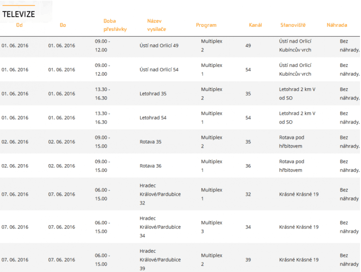 Opět to vezmeme kompletně a podíváme se po plánovaných výlukách televizních i rozhlasových vysílačů všude, kde to půjde. Tedy nejen u Českých Radiokomunikací (ČRa), ale také například u RTI cz, Teleko či na Multiplexu 4.