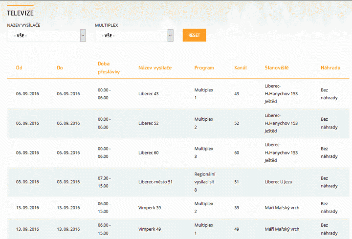 Opět to bereme kompletně a díváme se po plánovaných výlukách televizních i rozhlasových vysílačů všude možně. Nejen u Českých Radiokomunikací (ČRa), ale například i u RTI cz, Teleka či u společnosti Digital Broadcasting. Nyní, na počátku měsíce, je však hlášena pouze plánovaná údržba na televizních a rozhlasových vysílačích ČRa. V případě rozhlasových vysílačů začínáme 5. a v případě televizních 6. září. Největší várka pak přijde u TV i u rozhlasu 21. září 2016.